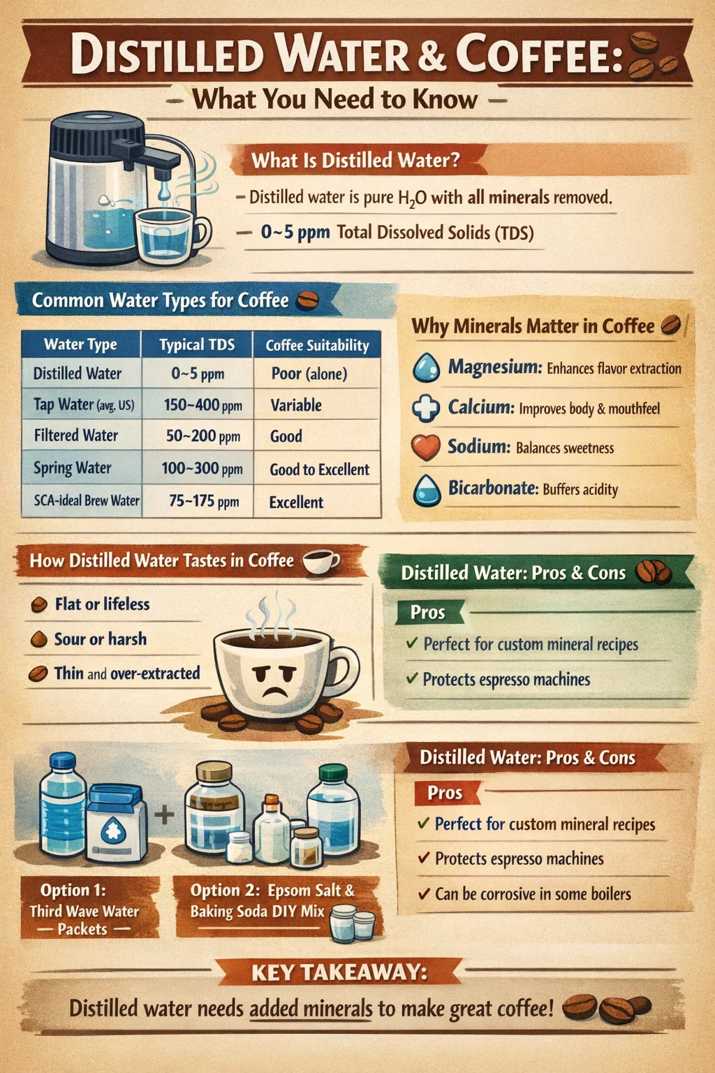 Artikel ini menguraikan dengan tepat apa yang terjadi ketika Anda menggunakan air sulingan untuk kopi, apa yang dikatakan ilmu pengetahuan, bagaimana faktor penyulingan air, dan alternatif apa yang memberi Anda hasil lebih baik tanpa perlu menebak-nebak.