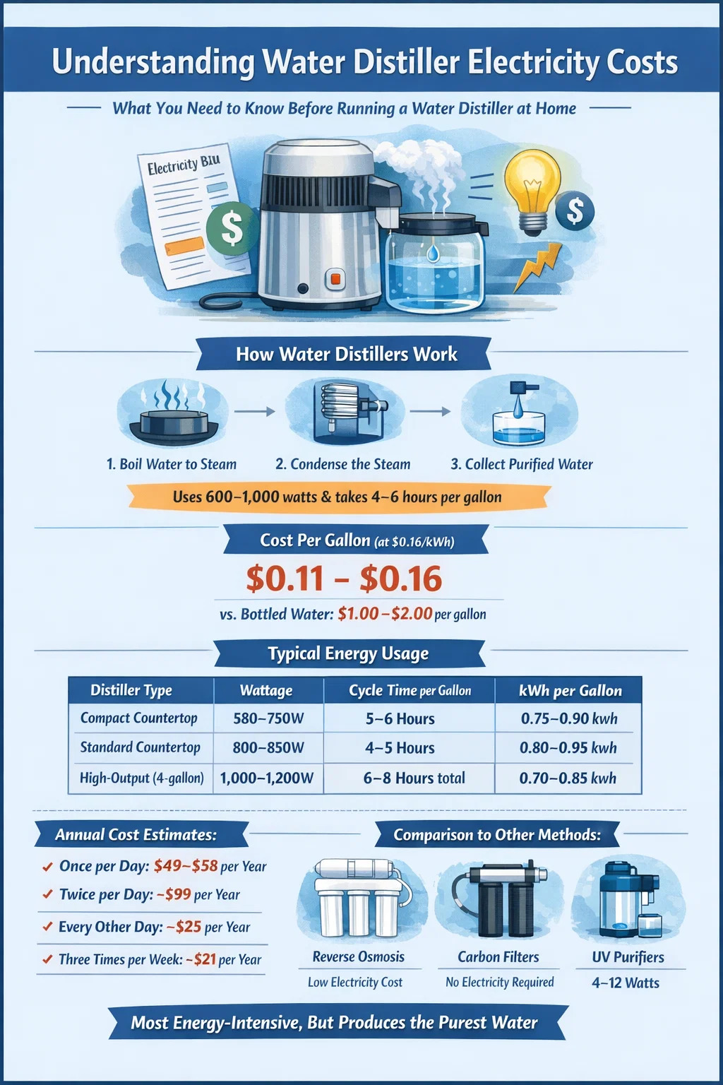 Bahkan pada penggunaan harian maksimum, biaya listrik tahunan untuk penyuling air rumah adalah jauh di bawah $100 bagi sebagian besar rumah tangga Amerika. Penduduk di negara bagian dengan tarif listrik lebih tinggi – California rata-rata sekitar $0,27/kWh, Hawaii mendekati $0,39/kWh – akan membayar jauh lebih mahal. Sebuah rumah tangga di California yang menjalankan penyulingannya sekali sehari akan menghabiskan lebih banyak uang $83 per tahun pada listrik untuk alat itu saja.