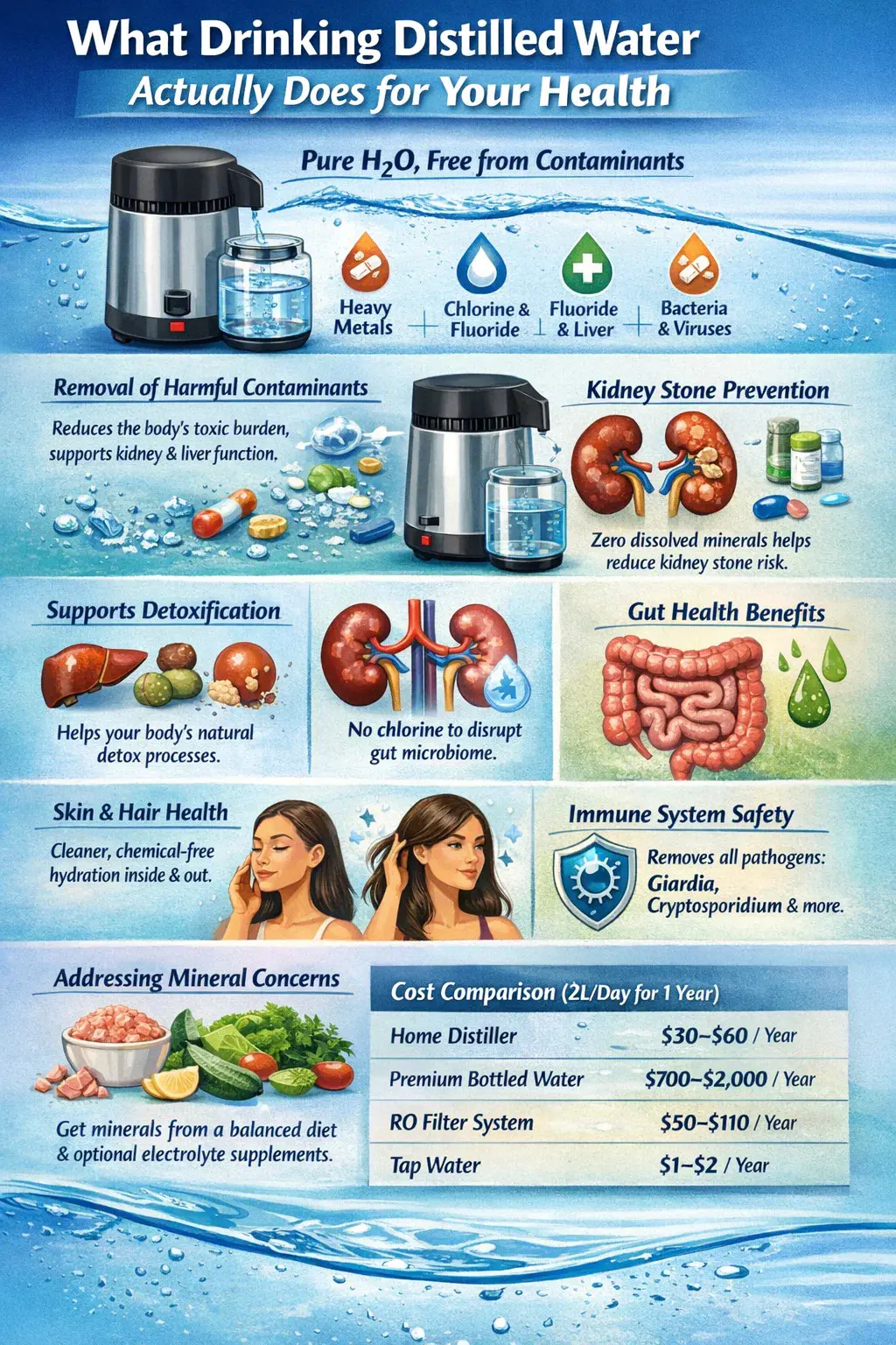 Manfaat kesehatan dari meminum air sulingan memang nyata, namun manfaat utama dari air sulingan adalah tidak adanya kontaminan, patogen, mineral yang tidak diinginkan, dan bahan tambahan kimia. Ini bukanlah hal kecil. Mengingat rata-rata orang mengonsumsinya secara kasar 700–1.000 liter air per tahun , perbedaan kumulatif antara air bersih secara konsisten dan air terkontaminasi seumur hidup adalah signifikan.