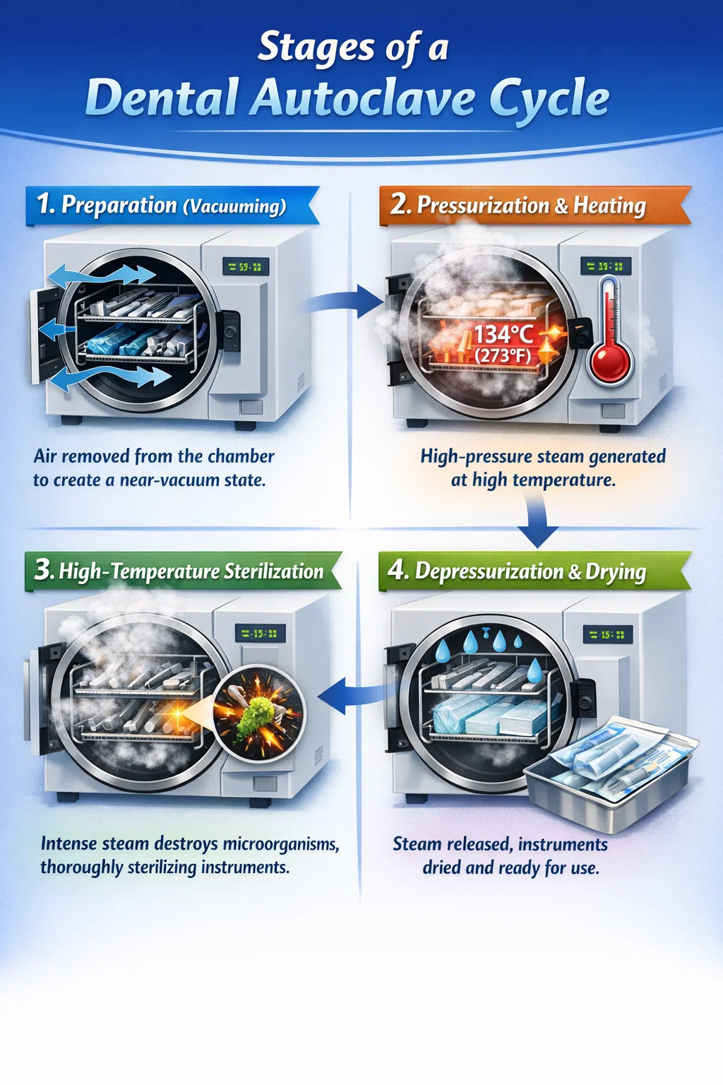 Autoklaf gigi, secara sederhana, berfungsi seperti versi terbaru dari alat pemasak tekanan rumah tangga. Mereka memanfaatkan kombinasi suhu tinggi, tekanan tinggi, dan uap untuk menghilangkan kontaminan mikroskopis pada instrumen bedah secara menyeluruh.