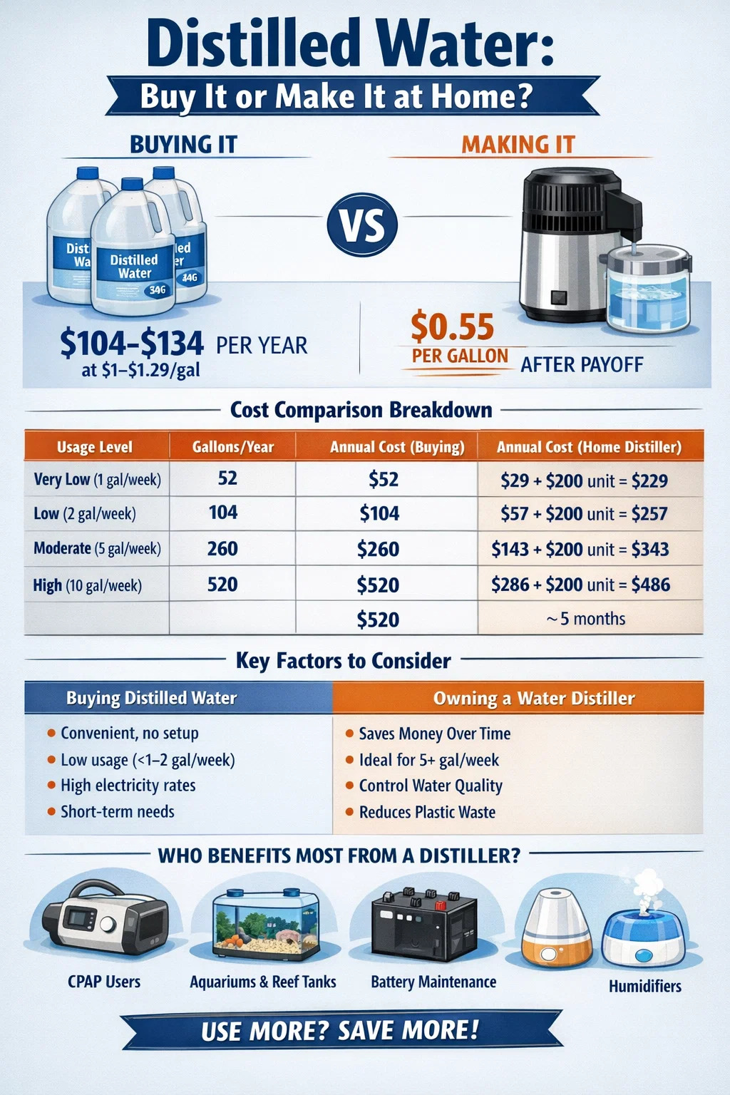 Produsen CPAP secara universal merekomendasikan air suling dalam ruang pelembab untuk mencegah penumpukan mineral dan pertumbuhan bakteri. Pengguna CPAP pada umumnya mengisi ruangannya setiap malam — sekitar 0,5 hingga 1 liter per penggunaan — mengonsumsi sekitar 1 galon (3,8 liter) per minggu. Itu berarti 52 galon per tahun. Dengan $1,00/galon dari toko, Anda menghabiskan $52 per tahun hanya untuk air CPAP. Dengan penyuling air yang beroperasi dengan harga $0,50/galon all-in, Anda menghabiskan $26/tahun untuk air CPAP setelah pengembalian. Selama periode 5 tahun dengan penyulingan seharga $200, total biaya penyulingan rumah untuk CPAP saja mencapai sekitar $330 vs. $460 untuk dibeli di toko — penghematan sekitar 30%. Jika Anda juga menggunakan penyuling untuk tujuan lain, penghematannya akan bertambah dengan cepat.