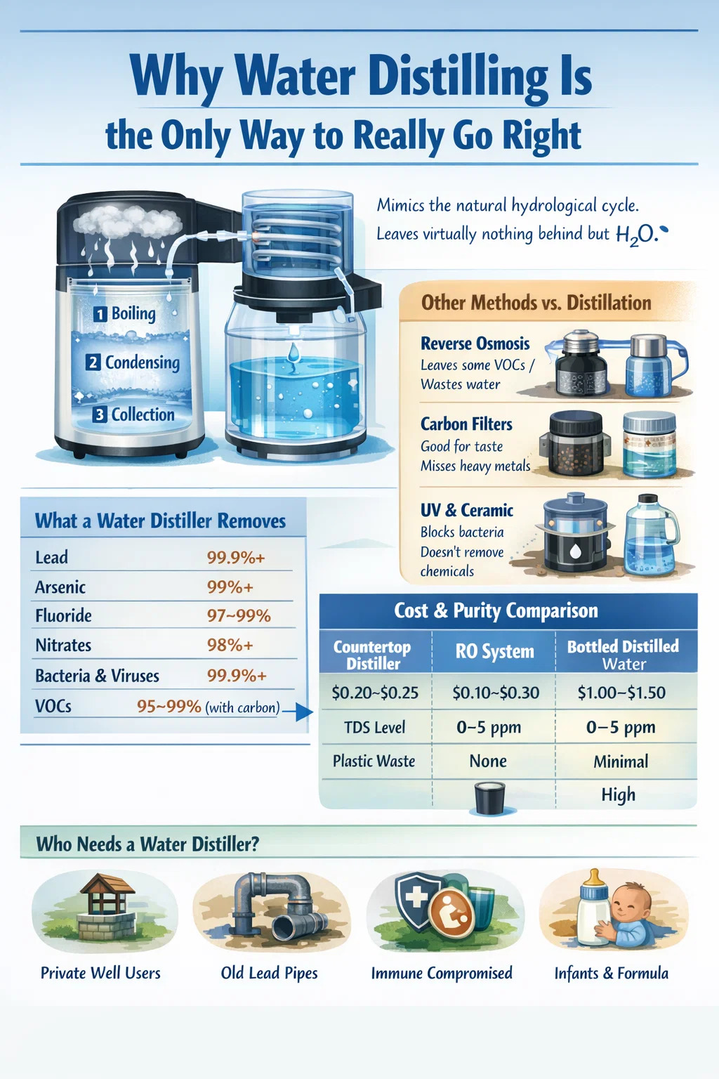 Metode penyaringan lainnya bersifat selektif. Mereka menargetkan kontaminan tertentu tetapi membiarkan kontaminan lain melewatinya. Filter karbon menghilangkan rasa klorin dengan baik tetapi hampir tidak berpengaruh apa pun terhadap timbal atau nitrat terlarut. Osmosis terbalik menghilangkan berbagai kontaminan tetapi berjuang dengan senyawa organik volatil tertentu yang menguap bersama uap air selama tekanan membran. Penyuling air tidak membeda-bedakan. Proses itu sendiri adalah mekanismenya, dan fisika tidak membuat pengecualian berdasarkan jenis kontaminan.