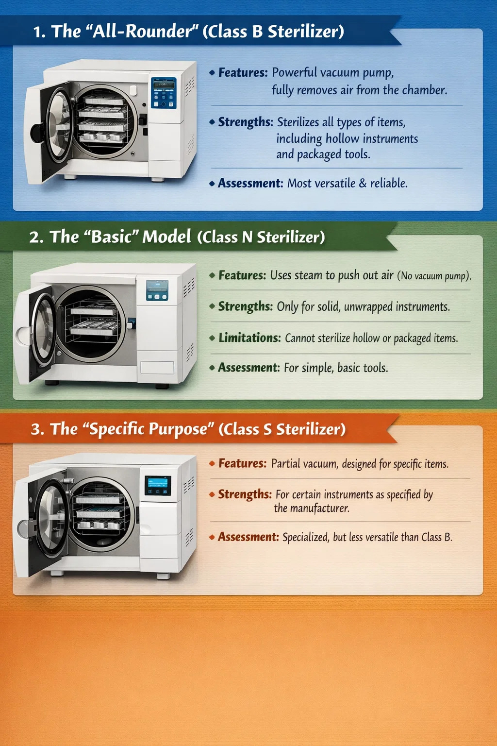Penilaian umum: Ini adalah mesin yang "tidak pilih-pilih"; hampir semua peralatan gigi dapat disterilkan di dalamnya, menjadikannya jenis yang paling andal.
