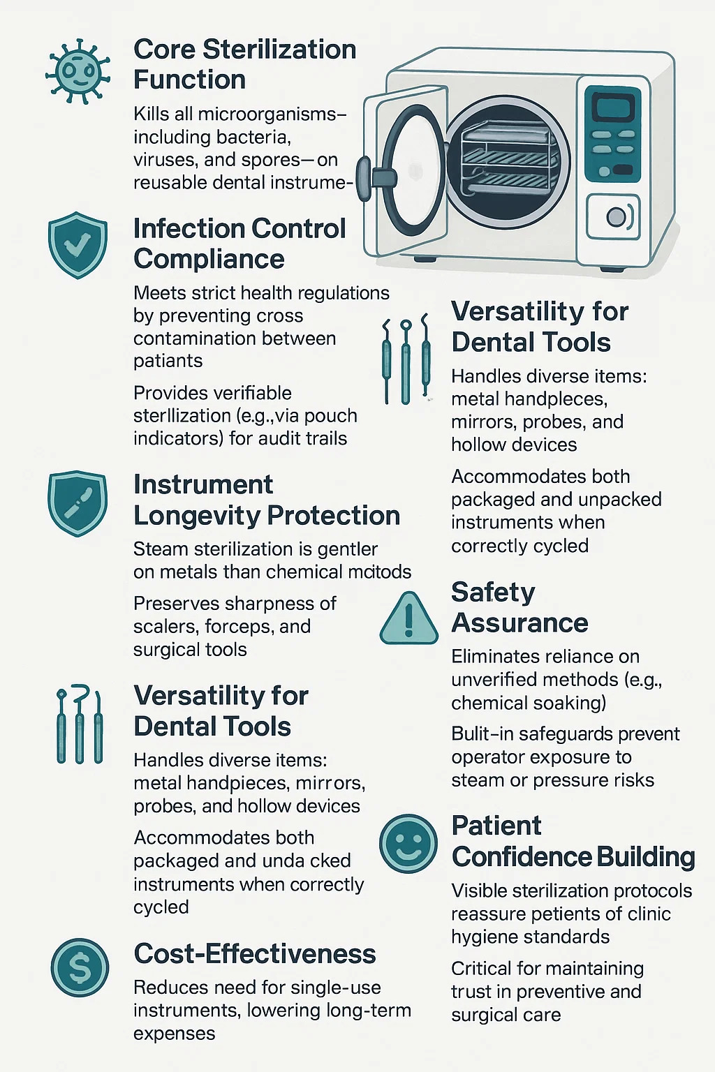 | Memperpanjang Umur Alat | Sterilisasi uap yang lembut (vs. bahan kimia keras) | Menjaga ketajaman & integritas instrumen logam |